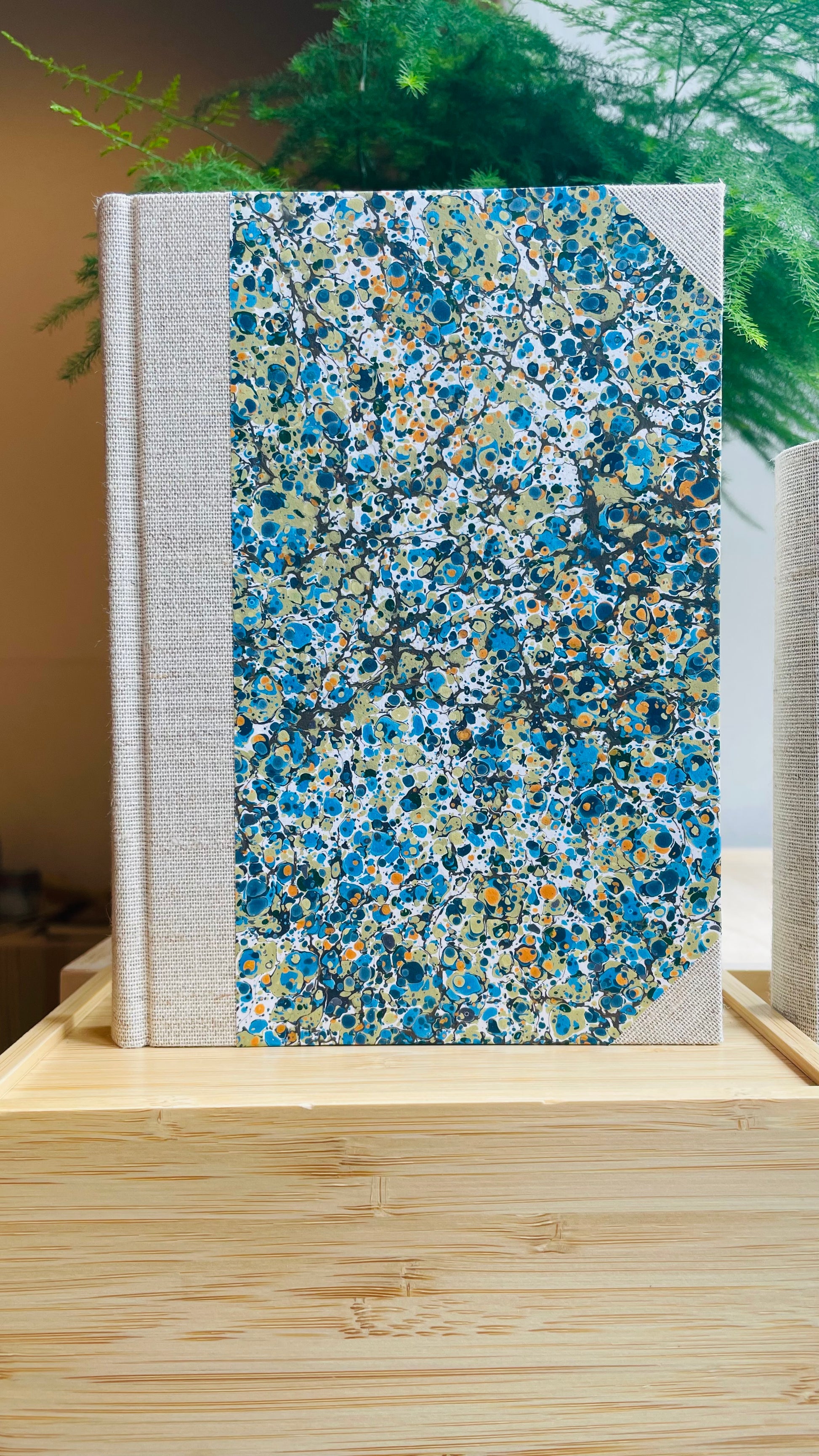 Perks cover papers are our own original marbled papers. The books have head band, and integrated silk bookmark