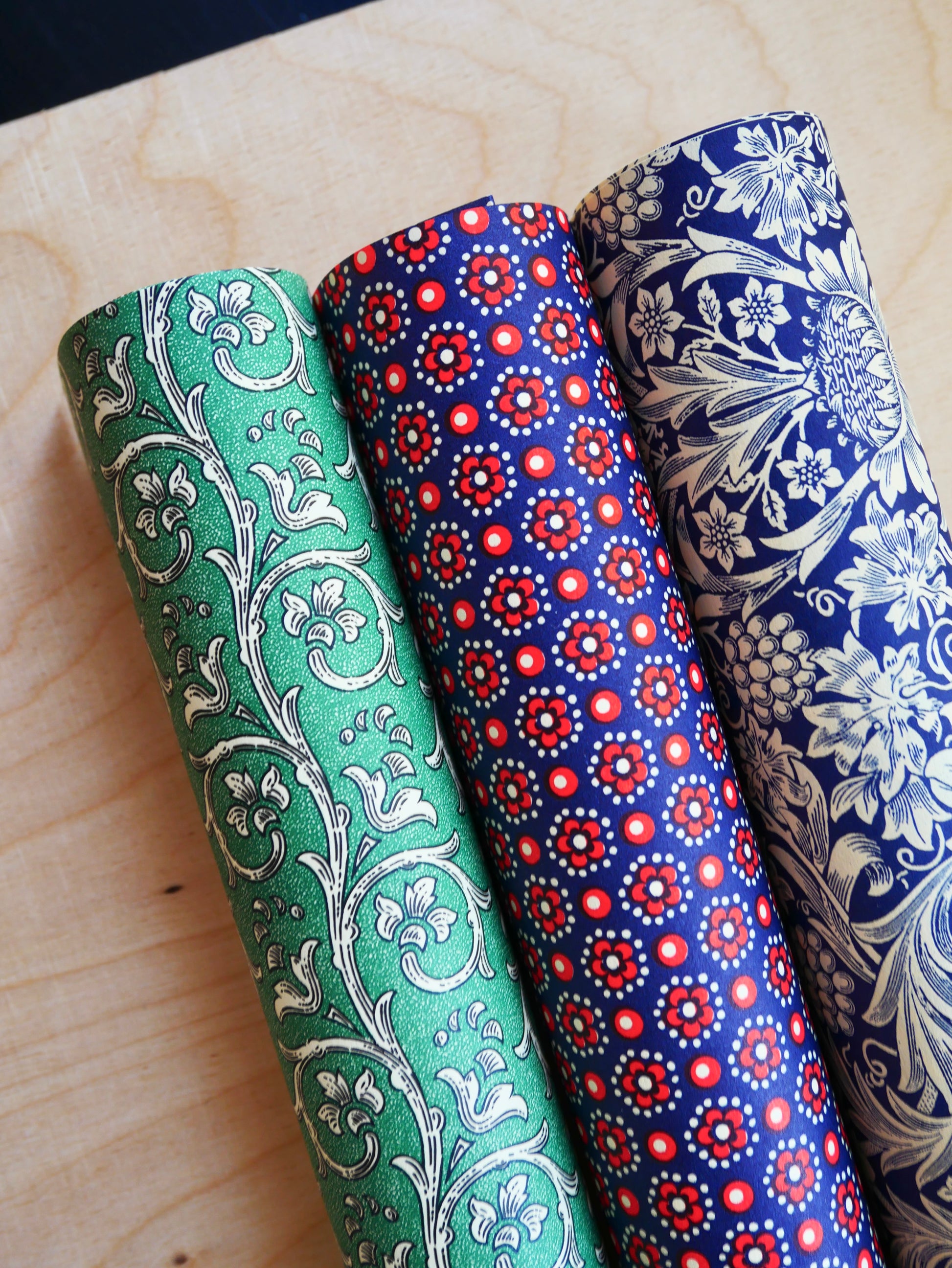This paper (meaning Carta in Italian) comes from northern Italy (the city of Varese) is made on high quality 100 gsm smooth acid free paper. It is perfect for bookbinding but also gift wrapping, paper craft and origami. Many patterns in the Carta Varese catalogue has roots in the Renaissance era. The blue pattern, Sunflower, is actually a William Morris design från 1879.