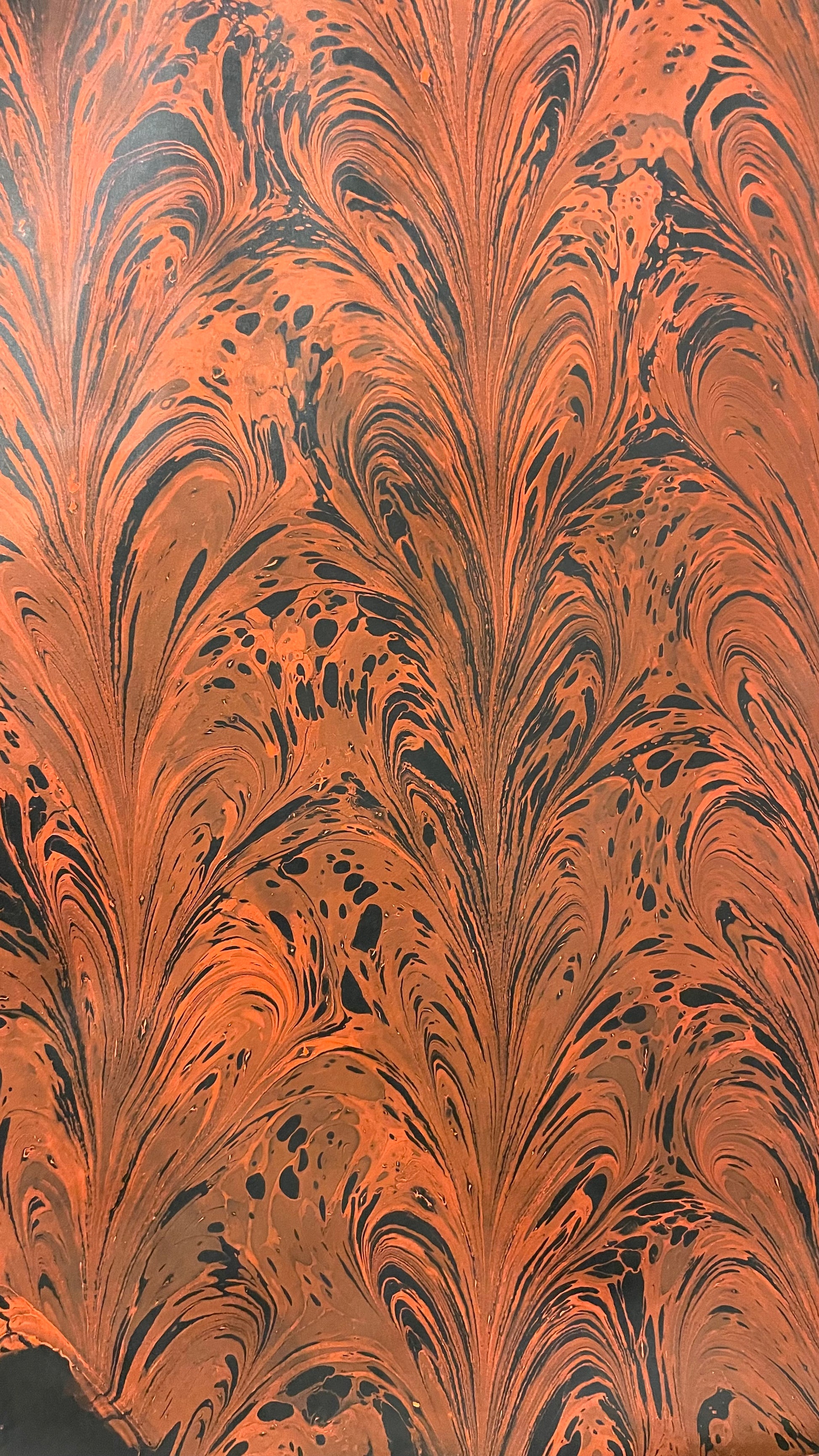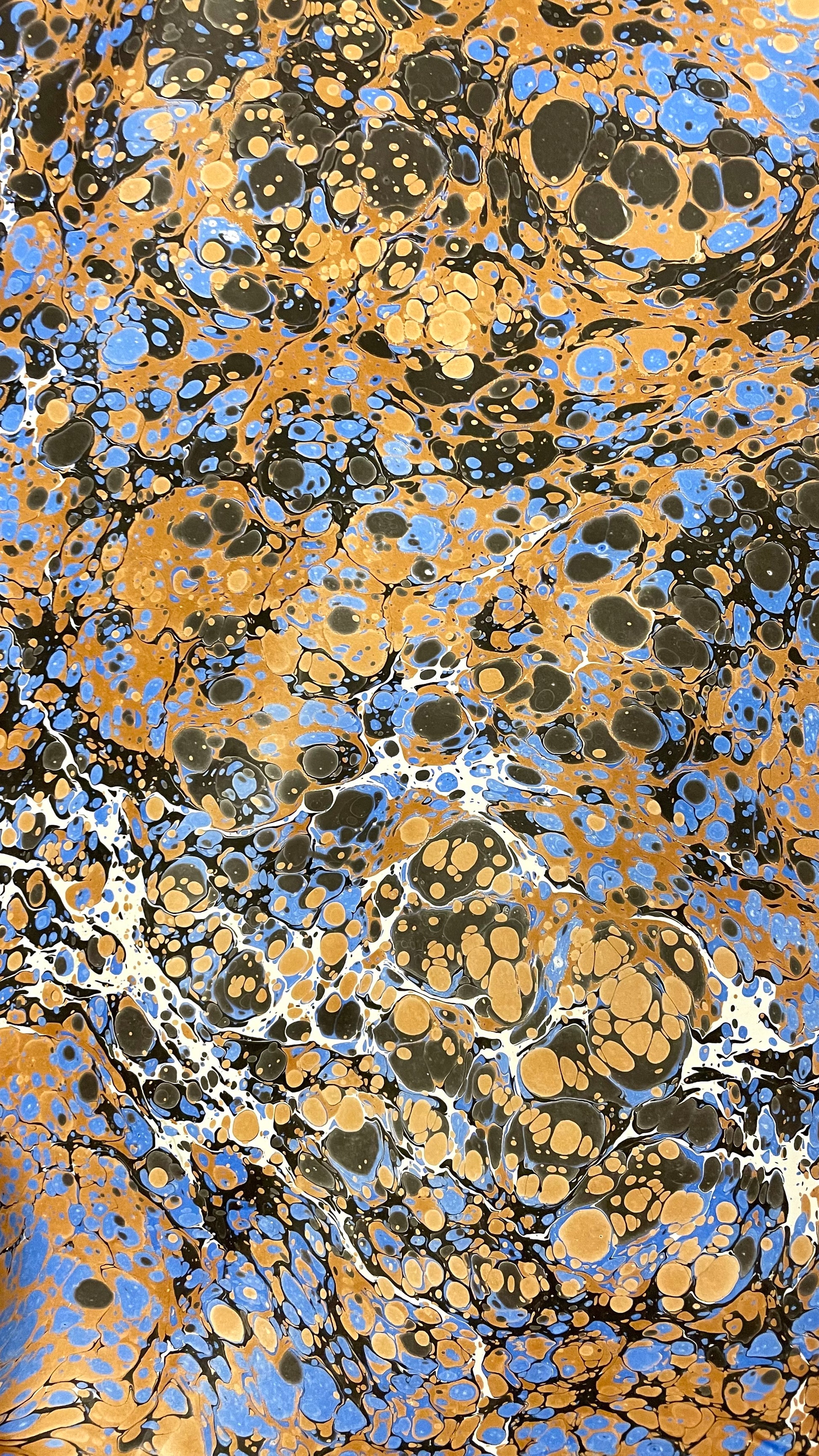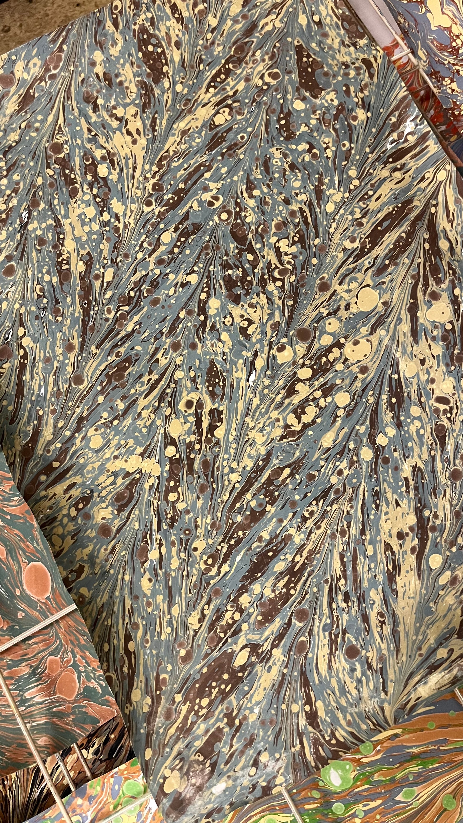 Lär dig marmorera papper enligt mönstertraditioner! Den här workshopen vänder sig till nybörjare, där vi gemensamt går igenom marmoreringens grunder och hur några av de vanligaste mönstren byggs upp.
