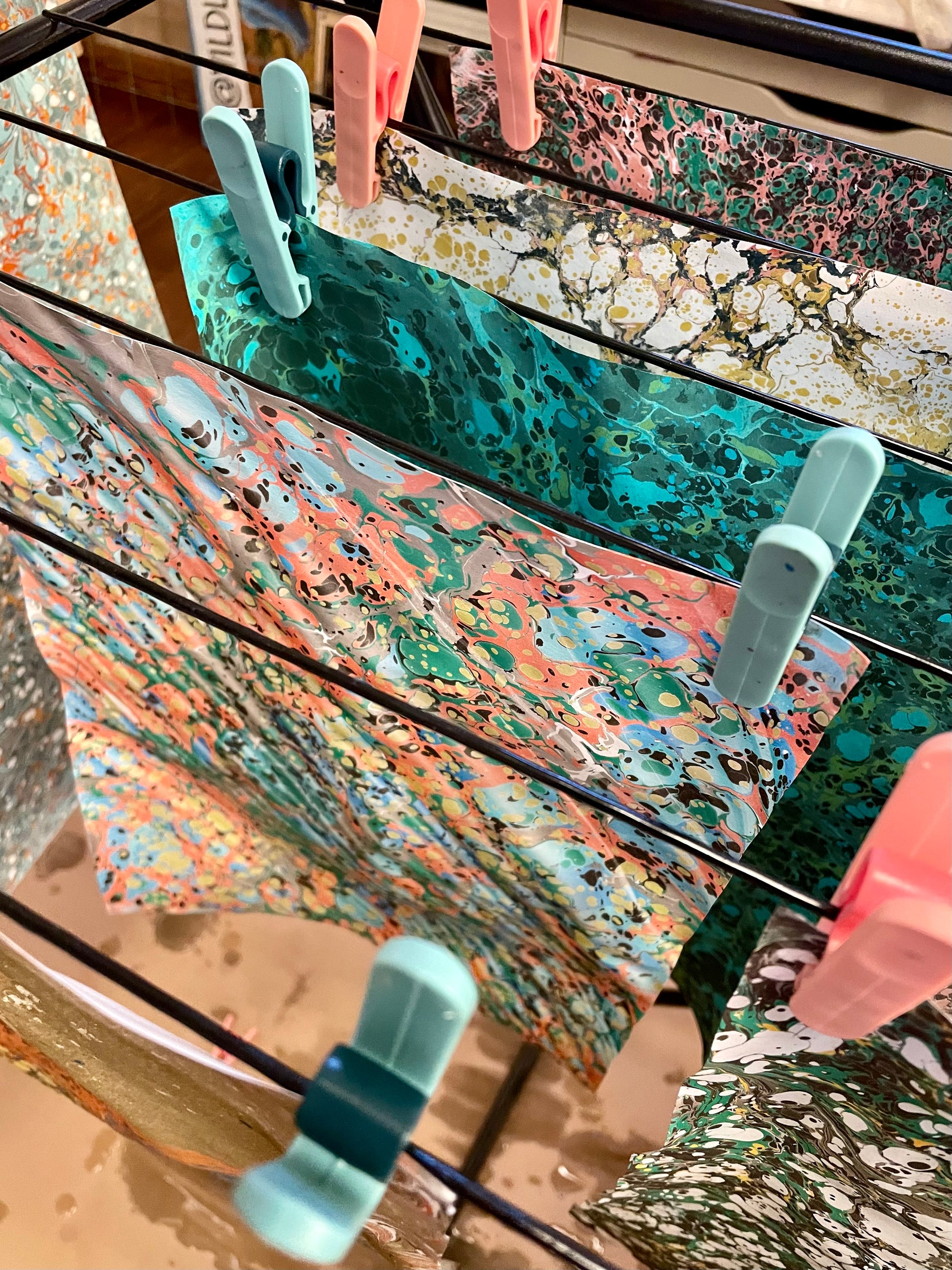 Du kommer att få med dig upp till cirka 10 marmorerade papper hem (beroende på hur mycket tid du lägger på varje papper) som kan användas till allt från papperspyssel till bokbinderi eller som vackra print att sätta upp på väggen. Eftersom pappren behöver tid för att torka, skickar vi pappret hem till dig inom 2 veckor. Tänk på att skriva den adress du vill ha dina papper skickade till när du gör din bokning.