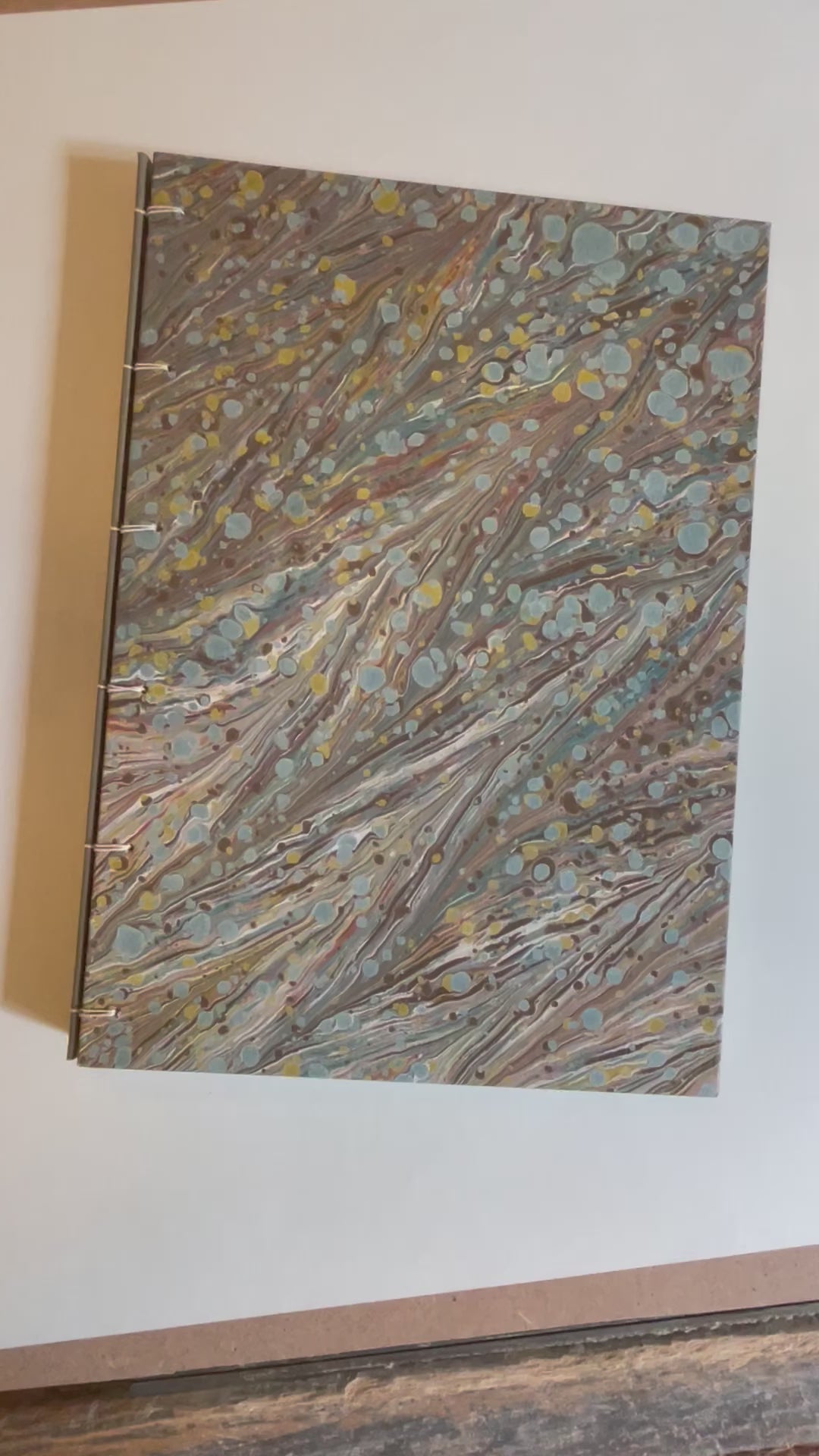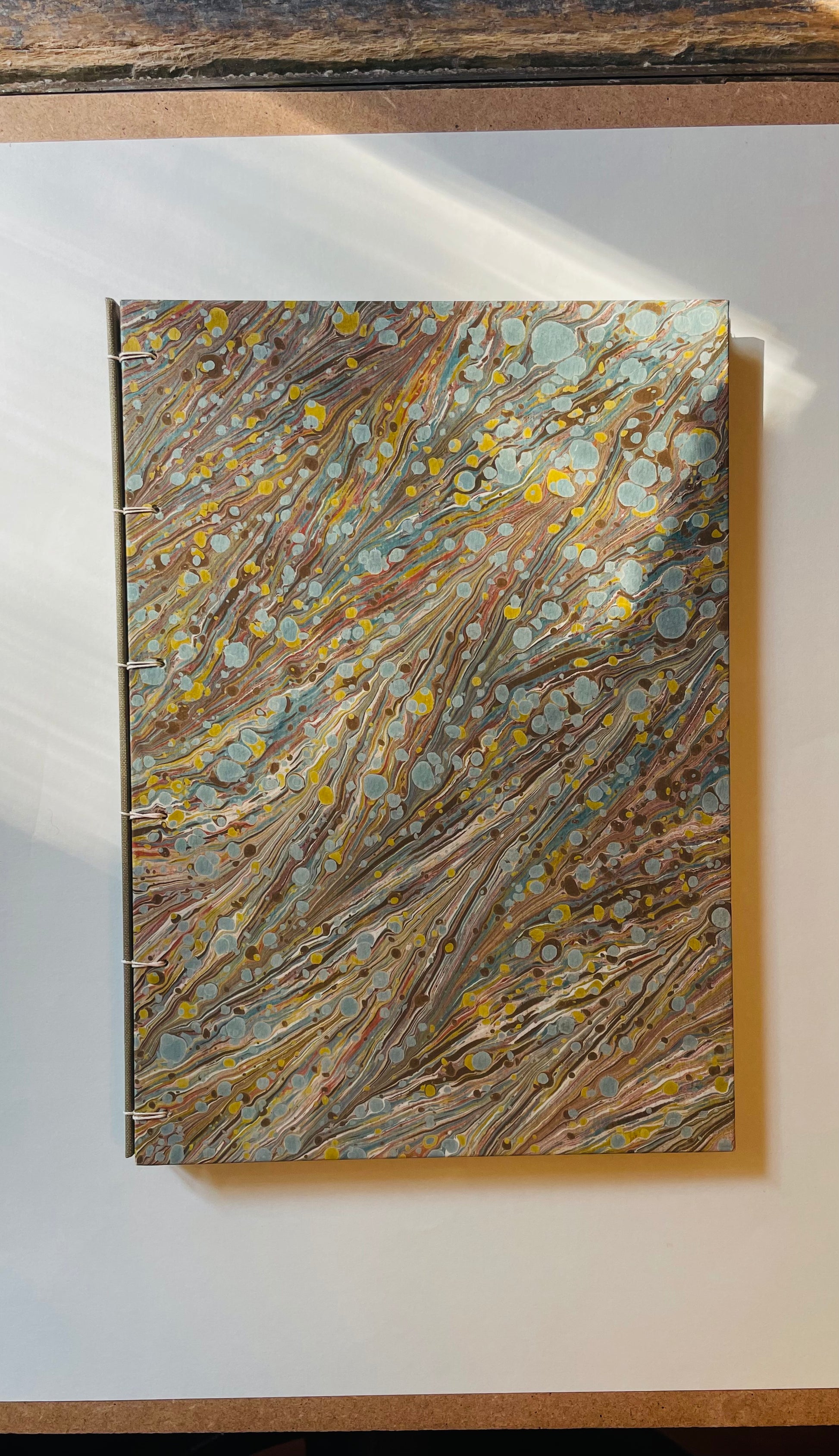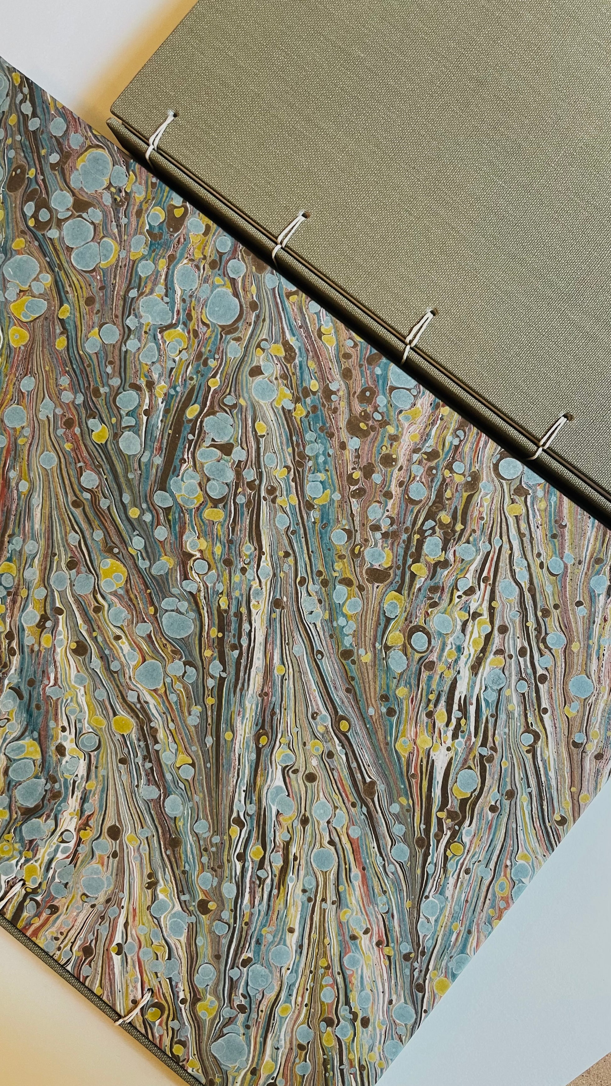Carefully handcrafted books made with the Secret Belgian Binding method and covered with our own original marbled paper and olive green book cloth. Truly one of a kind books!