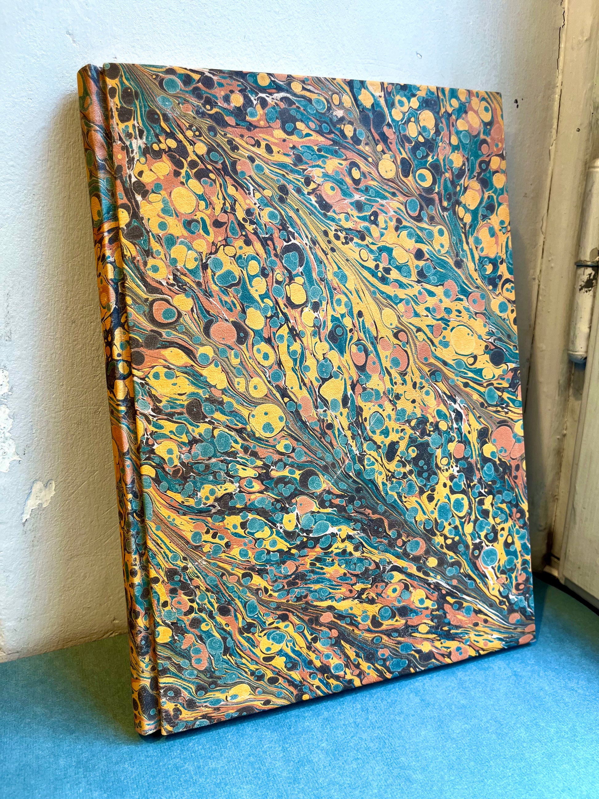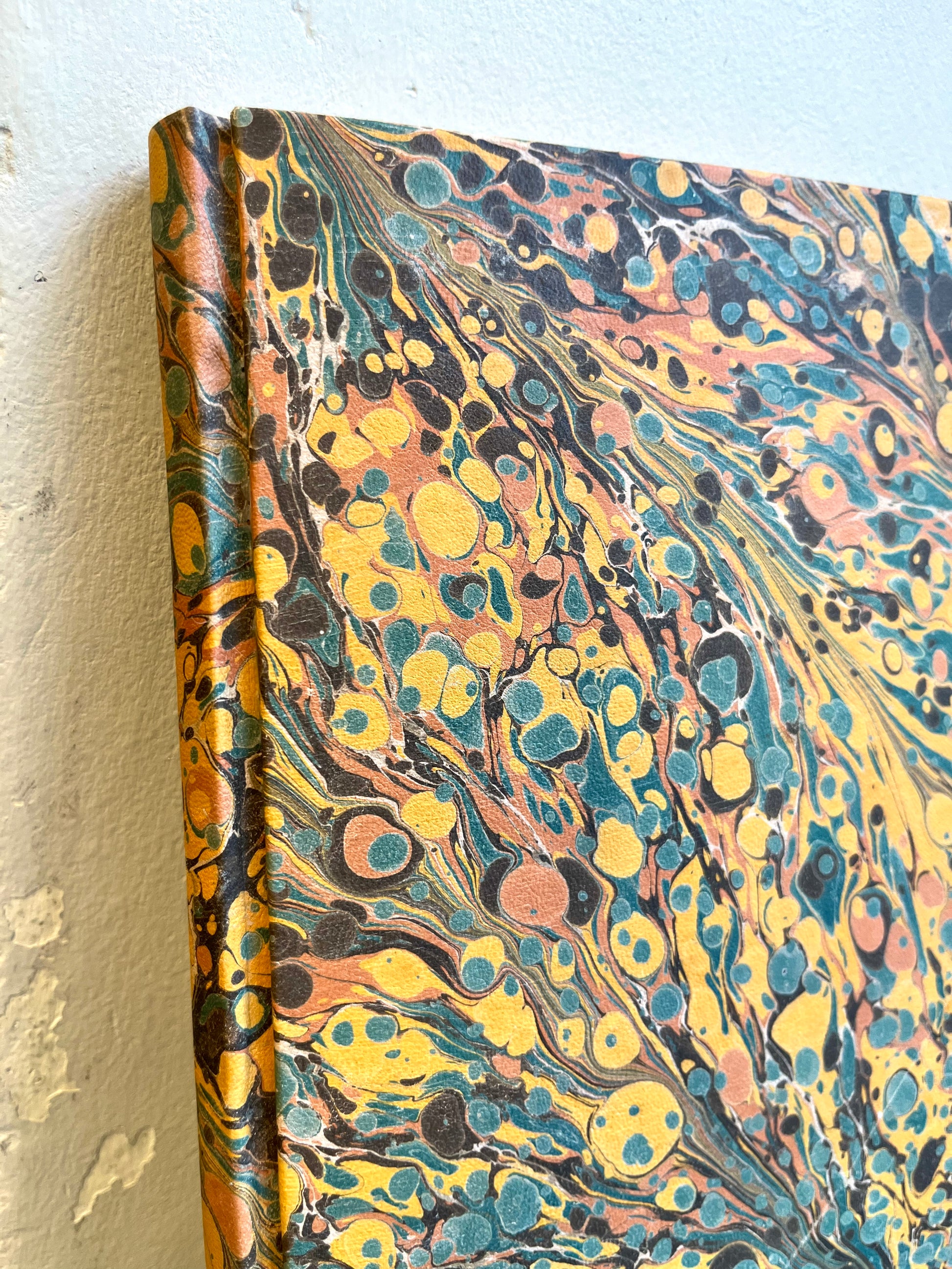 A book completely covered in our own original marbled leather! The type of binding is called "simplified leather binding", invented by the French bookbinding legend Sün Evrard as a method to streamline the process of making French leather bindings, making them look really elegant and sleek.